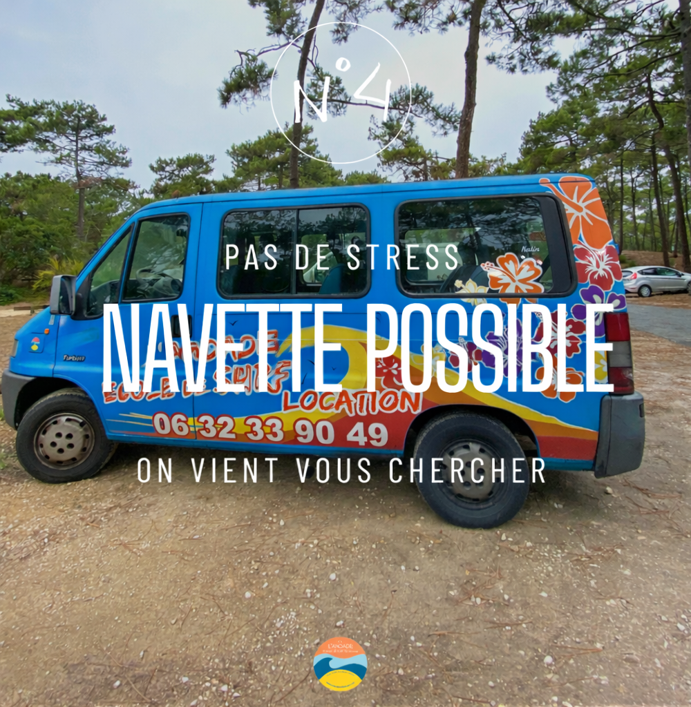Formule n°1 : Pour vous simplifier les vacances, vous éviter les bouchons mais aussi limiter l'impact sur notre environnement, L’ANDADE propose des cours et des stages de surf sur la Plage du Grand Crohot en intégrant le ramassage des stagiaires à des points d’arrêt définis. Ainsi, deux navettes (attention le nombre de places est limité) effectuent les ramassages au départ d’Andernos, d’Arès & de Lège Bourg ! Les horaires des départs de la navette sont fixés en fonction des marées et des conditions de mer. Il faut prévoir environ 3h30 entre le départ et le retour sur Andernos.